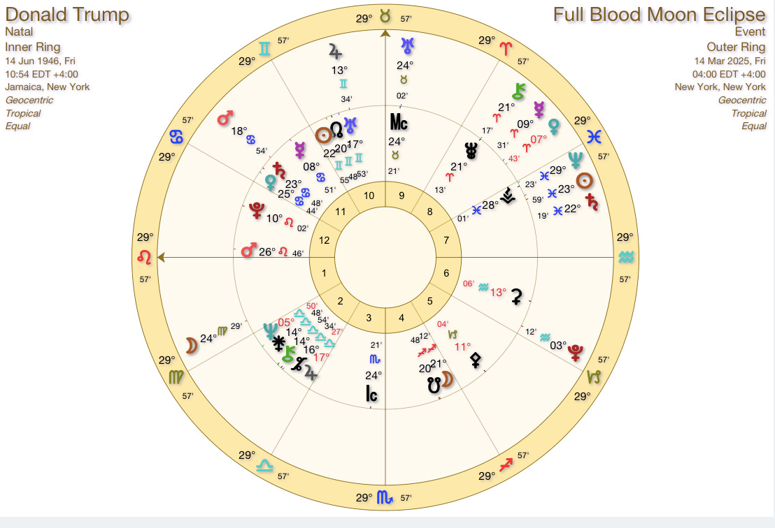 Another Substack astrologer, The Cunning Farmer gives a highly detailed analysis of the March eclipse season and points out that the eclipse and its nodal axis also aligns with the MC (Midheaven) / IC (Immum Coeli) axis in the natal chart of the United States.