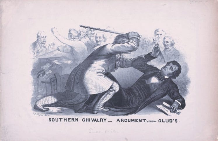 The strangest coincidence (and remember – there are no coincidences!) is that years ago Palmer foresaw a civil war-like split happening, heralded by a Democrat ‘raising a cane’ in Congress. This was inspired by an iconic image from a few years before the Civil War during the so-called Southern Chivalry argument.